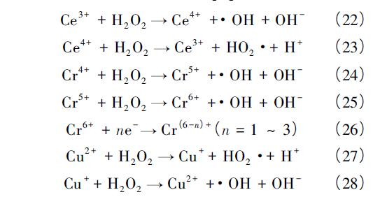 制約Fenton 法發(fā)展的因素之一為酸性介質(zhì)條件,該因素也被視為其突破點(diǎn)之一。為了滿足催化劑和H2O2之間的電子轉(zhuǎn)移,優(yōu)先考慮將多價(jià)態(tài),沉淀pH 范圍較高,且高價(jià)態(tài)可以充當(dāng)H2O2氧化劑、低價(jià)態(tài)可以充當(dāng)H2O2還原劑的元素作為理想Fenton 催化劑。目前,可滿足上述條件的元素有Ce、Cr、Co、Cu、Mn、Al 等,其中,Ce、Cr、Cu 成為催化反應(yīng)的關(guān)鍵循環(huán)步驟,分別如式( 22) —( 28) 所示。這些元素可在中性甚至堿性條件下催化H2O2分解為·OH。