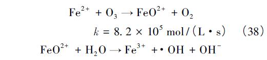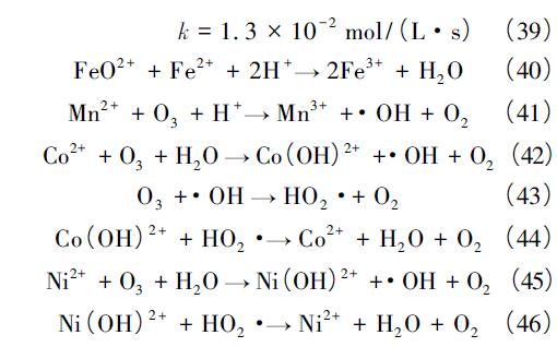 Hewes 等發(fā)現(xiàn),在Fe2+、Mn2+、Ni2+ 或者Co2+ 存在下,TOC 去除率比O3單獨(dú)氧化時(shí)更高。Bhat 等利用針鐵礦催化O3氧化氯苯,發(fā)現(xiàn)比單獨(dú)氧化更為高效。這些發(fā)現(xiàn)引起了人們對(duì)臭氧催化劑的廣泛關(guān)注。目前,均相臭氧催化劑主要是一些過(guò)渡金屬,如Cu2+、Zn2+、Fe2+、Mn2+、Ni2+、Co2+ 等。均相催化O3的機(jī)理主要有2 類。一類是金屬離子直接催化O3分解,通過(guò)一系列電子轉(zhuǎn)移過(guò)程產(chǎn)生·OH。例如,以Fe2+ 作為催化劑時(shí),它會(huì)與O3形成中間體FeO2+,與H2O 產(chǎn)生·OH,也可將Fe2+氧化為Fe3+,如式( 38) —( 40) 所示。Mn2+、Co2+、Ni2+催化O3的過(guò)程如式( 41) —( 46) 所示:
