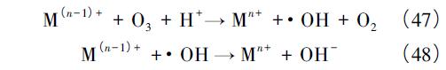 通過(guò)比較不同金屬對(duì)O3的催化過(guò)程,Wu 等總結(jié)了過(guò)渡金屬均相催化O3的總反應(yīng)式,如式( 47)所示; 當(dāng)催化劑過(guò)量時(shí),反而會(huì)淬滅·OH 降低氧化效率,如式( 48) 所示。