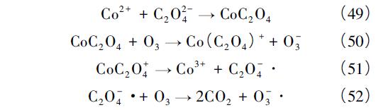 另一類均相催化O3機(jī)理是金屬離子與有機(jī)物或者O3進(jìn)行配位反應(yīng)而促進(jìn)O3和有機(jī)物的反應(yīng)。Pines 等在pH = 6 時(shí),采用Co2+ 催化O3氧化草酸時(shí)發(fā)現(xiàn)存在另一種非自由基的反應(yīng)路徑: 首先形成CoC2O4的絡(luò)合物,再由O3氧化為Co( C2O4) +,該中間體易分解為Co3+ 和C2O-4·,被O3、O2等氧化,如式( 49) —( 52) 所示: