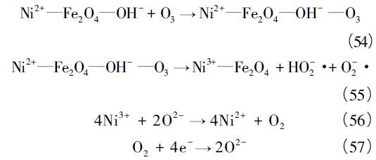 氧空位機(jī)理認(rèn)為,金屬氧化物表面存在許多晶格缺陷,這些缺陷可能影響O3的分解路徑,其中,磁性多孔尖晶石結(jié)構(gòu)MeFe2O4含有大量氧空位( Me 為金屬元素,有Ni、Mn、Co 等) 。以NiFe2O4為例,當(dāng)O3在氧化物表面發(fā)生化學(xué)吸附時(shí),部分Ni2+ 被氧化為Ni3+,并產(chǎn)生HO-2·與·O-2,通過(guò)電子轉(zhuǎn)移產(chǎn)生·OH,晶格氧將Ni3+還原為Ni2+,自身變成O2,形成空穴,在富氧條件下,空穴導(dǎo)電將O2還原為晶格氧,完成循環(huán),如式( 54) —( 57) 所示: