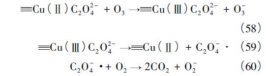 絡(luò)合機(jī)理認(rèn)為,因過(guò)渡金屬具有空的d 軌道,而大部分有機(jī)物含有苯環(huán)、雙鍵等電子云密度高的官能團(tuán),二者間易于形成金屬有機(jī)配合物,O3與配合物反應(yīng)而實(shí)現(xiàn)有機(jī)分子的氧化。例如,采用CeO2負(fù)載CuO 處理草酸時(shí)發(fā)現(xiàn)Cu( Ⅱ) 會(huì)與C2O2-4形成絡(luò)合物,二價(jià)銅草酸絡(luò)合物被O3氧化為極不穩(wěn)定的三價(jià)銅草酸絡(luò)合物,在配體分子內(nèi)發(fā)生電子轉(zhuǎn)移重新形成Cu( Ⅱ) 并產(chǎn)生強(qiáng)還原性的C2O-4·,被O2、O氧化,如式( 58) —( 60) 所示: