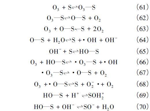 pH 影響非均相催化反應(yīng)的路徑。Beltrán 等研究發(fā)現(xiàn),當(dāng)pH = 2 ~ 6 時(shí),O3在催化劑表面吸附分解為氧原子,與H2O 生成·OH,若以S 代表催化劑表面的活性位點(diǎn),反應(yīng)如式( 61) —( 64) 所示。當(dāng)pH>6時(shí),體系中OH-在催化劑上形成表面羥基,進(jìn)而催化O3生成·OH,反應(yīng)如式( 65) —( 68) 所示。另外,體系pH 與催化劑的零電點(diǎn)( pHPZC) 之間的關(guān)系將影響催化劑表面羥基形態(tài)及O3吸附。當(dāng)pH <pHPZC,催化劑表面羥基發(fā)生質(zhì)子化,主要以—OH+2的形式存在,更有利于O3吸附; 當(dāng)pH>pHPZC,催化劑表面羥基發(fā)生去質(zhì)子化,主要以—O- 的形式存在,分別如式( 69) —( 70) 所示: