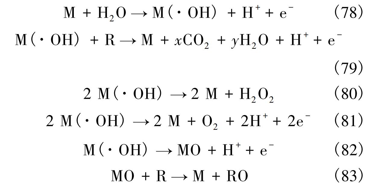 隨著 AOPs 的興起,出現(xiàn)了利用電化學(xué)方法處理廢水的技術(shù)。目前,該類技術(shù)發(fā)展了許多穩(wěn)定高效的電極材料,DSA 電極( dimension stable anodes) 、BDD電極( boron - doped diamond anodes) 、Ebonex 電 極、 NTA 電極( nanotube arrays) 等。電化學(xué)氧化是指利用電場(chǎng)直接氧化或間接產(chǎn)生·OH、O-2·等自由基降解污染物。其機(jī)制主要分為陽極直接氧化和間接自由基氧化。前者是指吸附在陽極的有機(jī)分子因失去電子而被氧化,但降解能力有限;后者是指通過電極反應(yīng)產(chǎn)生·OH、O-2·等自由基或O3、H2O2 等氧化劑氧化有機(jī)分子。在水相中,H2O 在陽極表面被氧化成吸附態(tài)的·OH,也可能分解產(chǎn)生O2、H2O2 等。此外,還可能使陽極材料進(jìn)一步轉(zhuǎn)化為更高價(jià)的氧化態(tài) MO,如式( 78) —( 83) 所示: