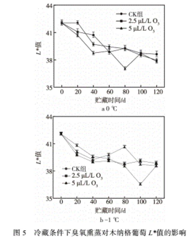 色差體系中,L*值代表了所測樣品的黑白度,即亮暗程度。L*高則樣品表面鮮亮,L*值降低則光澤變差。圖5可知,隨著貯藏時間的延長,各處理組木納格葡萄表皮L*均呈現(xiàn)逐漸下降的趨勢。-1℃和0℃條件下,各處理組貯藏期間L*大小關(guān)系表現(xiàn)為2.5μL/LO3處理組>對照組>5μL/LO3處理組,但差異不顯著(P>0.05)。貯藏期結(jié)束時,-1℃和0℃條件下CK、2.5μL/L和5μL/LO3處理組表皮L*值分別為38.58/37.97,38.85/38.62,38.54/37.83。可以看出較低溫度在保持表皮色澤上優(yōu)勢明顯,5μL/L臭氧熏蒸組的果實色澤較差,外觀劣變明顯。需要注意的是,2.5μL/L臭氧熏蒸木納格葡萄其L*高于其它2組處理組,但其果肉卻表現(xiàn)出一定程度的褐變,認(rèn)為臭氧在保持果實表皮色澤時對果肉產(chǎn)生了一定的傷害。