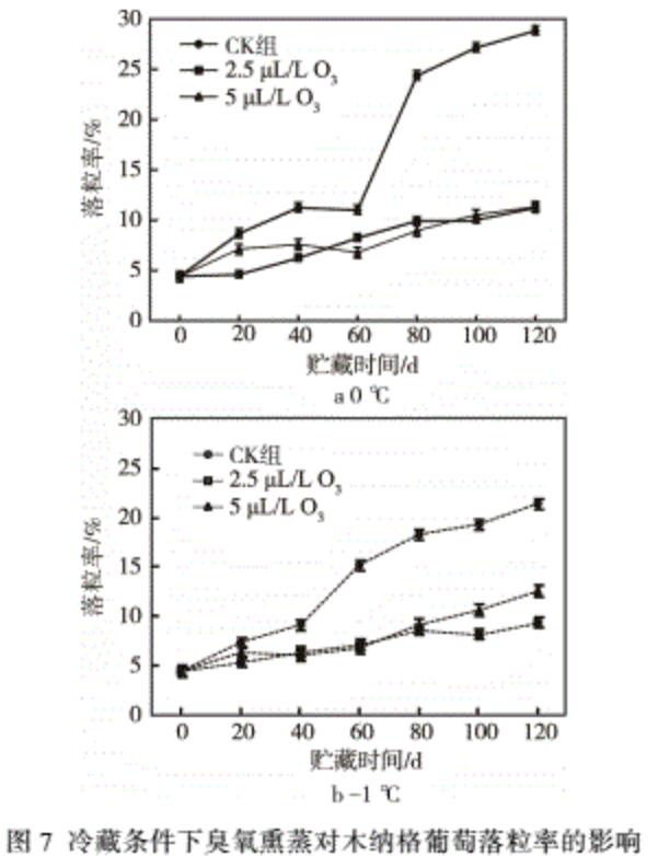 2.6 冷藏條件下臭氧熏蒸對木納格葡萄貯藏期間落粒率的影響