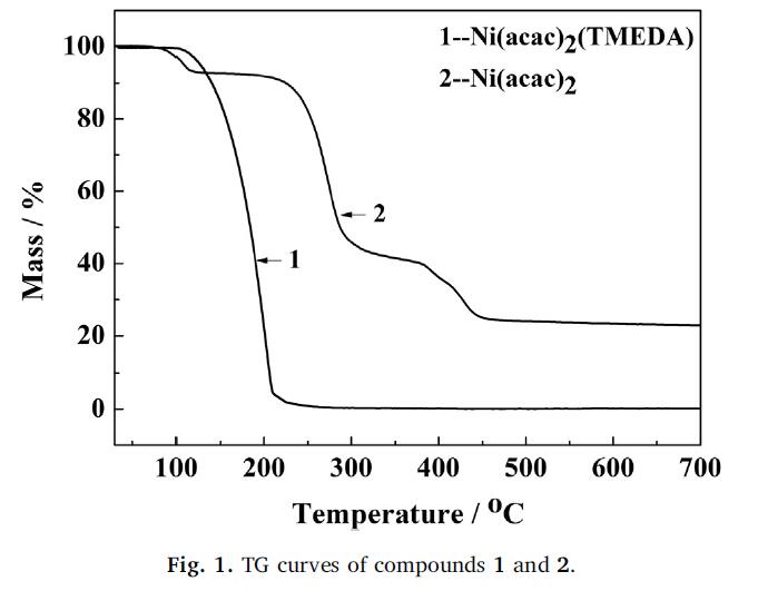 使用 STA 449 F3 分析儀在氬氣中以 10 °C/min 的加熱速率從 30 到 700 °C 分析化合物的熱性能。使用商業(yè) ALD 反應(yīng)器 (MNT f-150-212) 進(jìn)行沉積,薄膜被沉積在 SiO2/Si(100) 襯底上。 Ni (acac)2(TMEDA) 用作前驅(qū)體,其升華溫度保持在 95 °C(產(chǎn)生的蒸汽 0.3 Torr/1 atm 壓力,Ni 前驅(qū)體劑量 0.6*10−8 mol/s)。臭氧(O3,在 O2 中的體積濃度約為 7%)由
