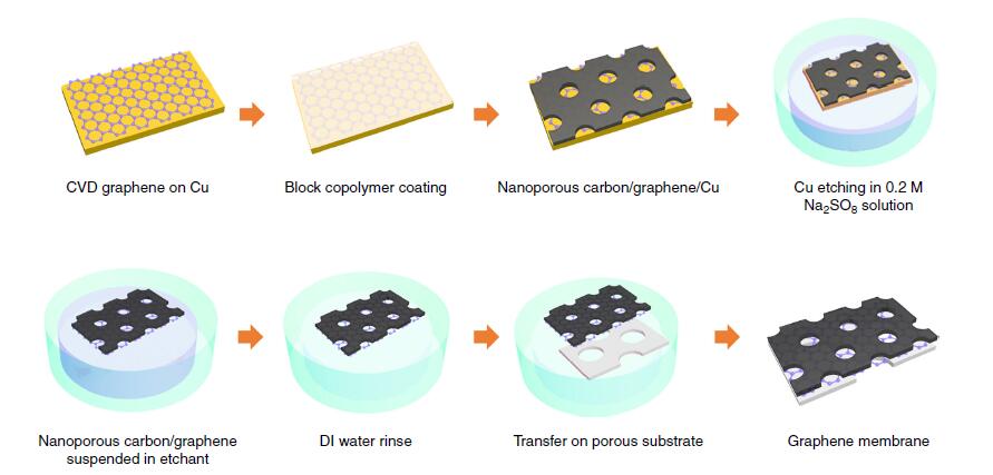 臭氧功能化的蝕刻和孔改性化學(xué)來蝕刻氫選擇性孔,并縮小孔徑,提高 H2 滲透性(高達 300%)和 H2/CH4 選擇性(高達 150%)??傮w而言,本文開發(fā)的可擴展轉(zhuǎn)移、蝕刻和功能化方法有望使納米多孔石墨烯膜更接近現(xiàn)實。