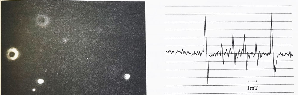 圖2左空氣納米氣泡的顯微鏡照法        圖2右二氧化碳納米氣泡的ESR頻譜