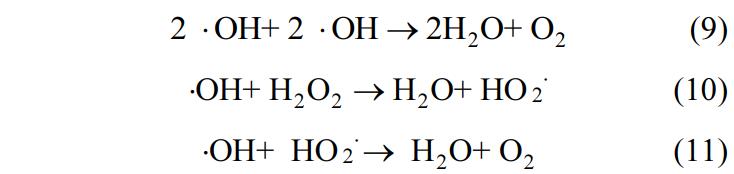 然而,過量地增加 H2O2 并不會進一步提升COD 去除率,反而會抑制 COD 去除率和速率.如圖 3 所示,當 H2O2 投加量增加到 10g/L 時,COD去除率和反應(yīng)動力學(xué)常數(shù)分別降低到 56.2%和k10g/L =1.49×10-2min-1,相比 5g H2O2/L,降幅分別為 11.6%和 32.4%.這主要原因是溶液中存在大量 H2O2 時會與·OH 發(fā)生淬滅反應(yīng)[21],如式(9~11)所示.