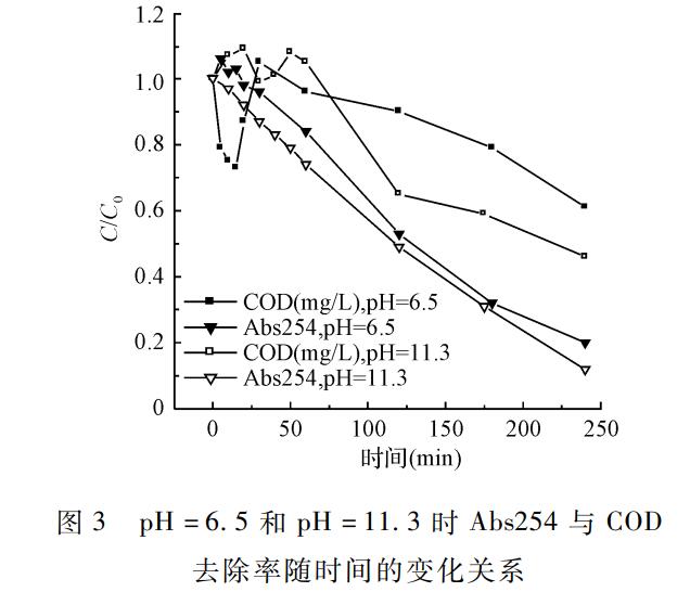 反應(yīng)一-開(kāi)始,●OH自由基就將大量的大分子有機(jī)物分解成小分子有機(jī)物,易被重鉻酸鉀氧化,從而短時(shí)間內(nèi)COD飆升(此解釋適用于圖3~圖5中COD上升的現(xiàn)象)。這個(gè)現(xiàn)象和原因解釋與Lin等在文獻(xiàn)中的報(bào)道一-致9,10]。與pH=6.5對(duì)比可知:60min后,COD呈下降趨勢(shì),下降速率遠(yuǎn)遠(yuǎn)高于酸性條件下pH=6.5時(shí)60min后降解的速率。從而證明了羥基自由基的非選擇性以及高效性。