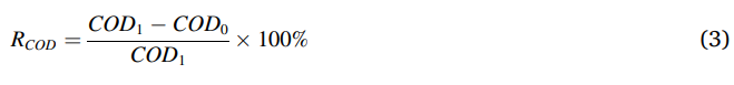 式中,RCOD為COD降解效率,COD1、COD0分別為降解前后水樣的COD, mg⋅L−1。