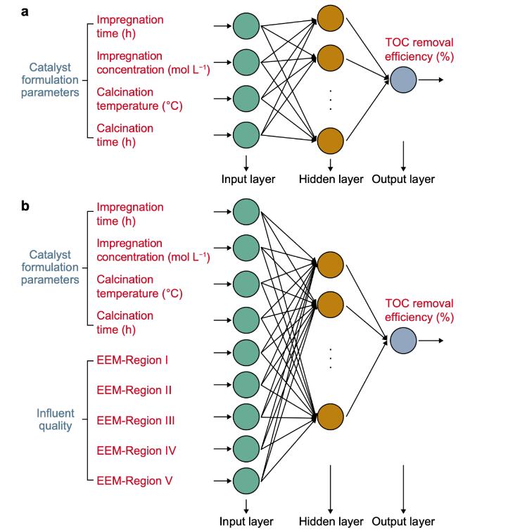 圖3 人工神經(jīng)網(wǎng)絡(luò)模型結(jié)構(gòu):a, ANN1(催化劑配方作為輸入變量);b, ANN2,(催化劑配方和熒光數(shù)據(jù)作為輸入變量)