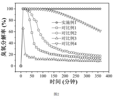 [0034] 圖2是實(shí)施例1和對(duì)比例1~4中的臭氧分解率隨時(shí)間變化圖。