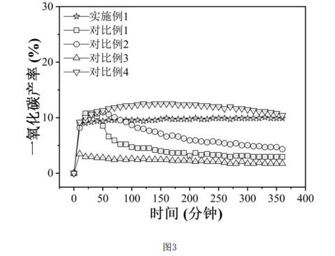 [0035] 圖3是實(shí)施例1和對(duì)比例1~4中的一氧化碳產(chǎn)率隨時(shí)間變化圖。