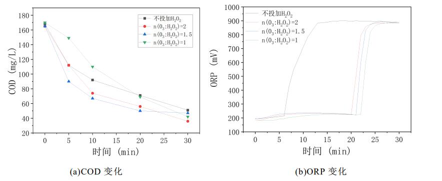 在以往的實際工程應(yīng)用中,根據(jù)不同的水質(zhì)精確投加雙氧水是廣泛的技術(shù)難題。雙氧水投加量過少,催化臭氧效果差,造成不必要的臭氧浪費,雙氧水投加量過多會貢獻(xiàn)多余的 COD,使檢測結(jié)果出現(xiàn)偏差。由于上文中提出 ORP 值可以代替臭氧暴露值反映臭氧氧化效能,故本文提出使用 ORP 值來指導(dǎo)雙氧水的投加量,解決投加量不精確的難題。