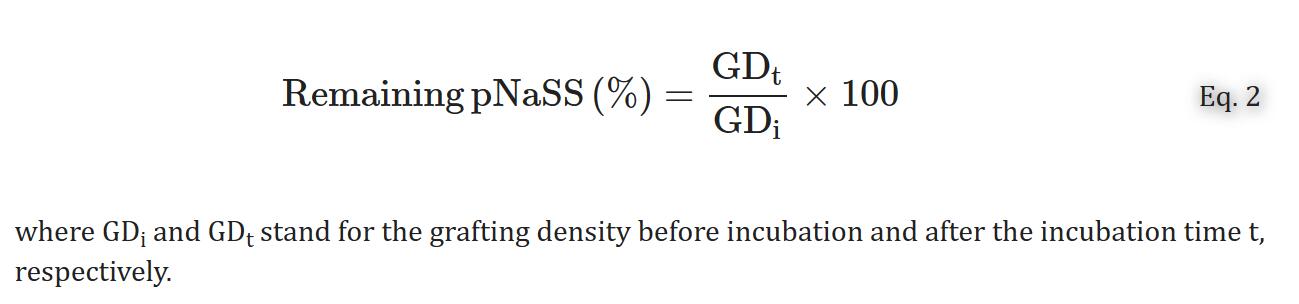 為了研究pNaSS接枝的穩(wěn)定性,將滅菌的薄膜浸入無菌PBS(pH = 7.1)中,并在37°C下在5%CO的加濕氣氛中孵育2在空氣中停留不同的時(shí)間段。在孵育結(jié)束時(shí),監(jiān)測(cè)PBS的pH值,并將樣品在PBS中洗滌過夜。通過BT方法測(cè)定孵育膜上殘留的接枝pNaSS的量,并根據(jù)公式2計(jì)算: