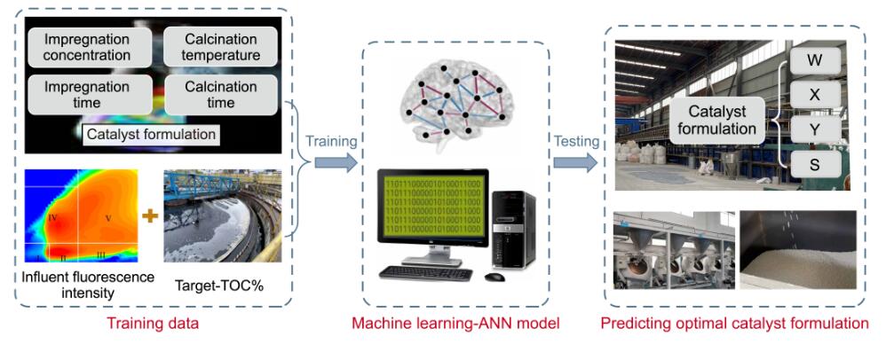 催化臭氧氧化因其對難降解有機(jī)物的礦化性強(qiáng)而被廣泛用于廢水深度處理。而在實(shí)際廢水中,不同臭氧催化劑對不同有機(jī)物的降解表現(xiàn)出差異性,影響因素復(fù)雜。因此,高礦化的關(guān)鍵在于催化劑配方與廢水水質(zhì)的適配性。機(jī)器學(xué)習(xí)可以大大提高實(shí)驗(yàn)效率,而熒光數(shù)據(jù)可以提供廢水水質(zhì)中關(guān)于有機(jī)物組成和濃度的信息,有利于催化劑配方的優(yōu)化。本研究采用機(jī)器學(xué)習(xí)(ANN,人工神經(jīng)網(wǎng)絡(luò)模型)并結(jié)合熒光光譜技術(shù),開發(fā)了適配于目標(biāo)廢水的臭氧催化劑(圖1)。