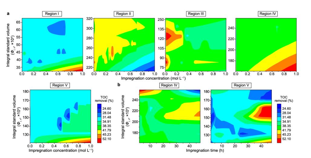圖4 催化劑配方和進(jìn)水水質(zhì)對催化劑性能(TOC去除率)的影響。a,浸漬濃度和熒光有機(jī)物。b,浸漬時間和熒光有機(jī)物。